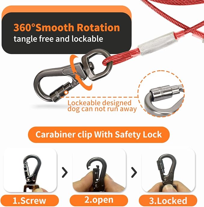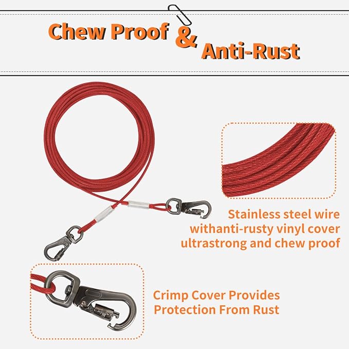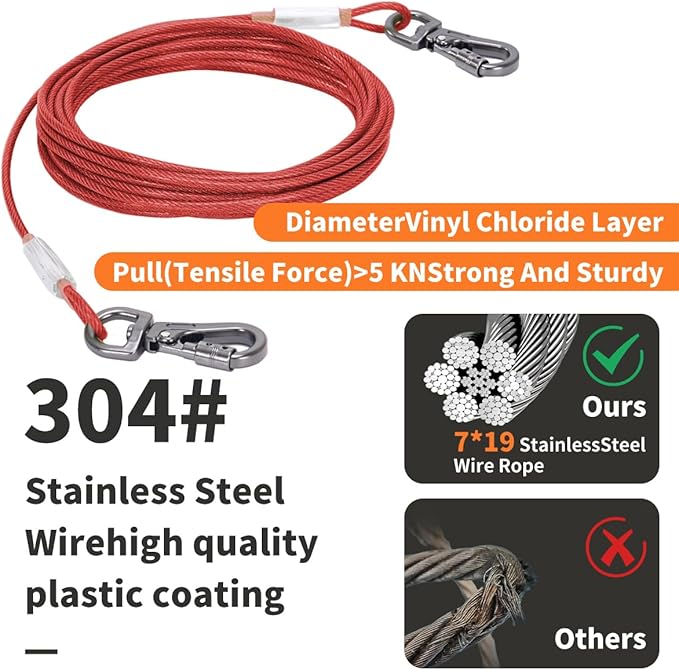 - High-Quality Cable: Engineered with steel wire rope and reinforced PVC coating, heavy duty tie-out cable delivers.Built to last with rust-proof materials for ultimate corrosion resistance,Double crimp for stronger ends,your peace of mind is guaranteed.