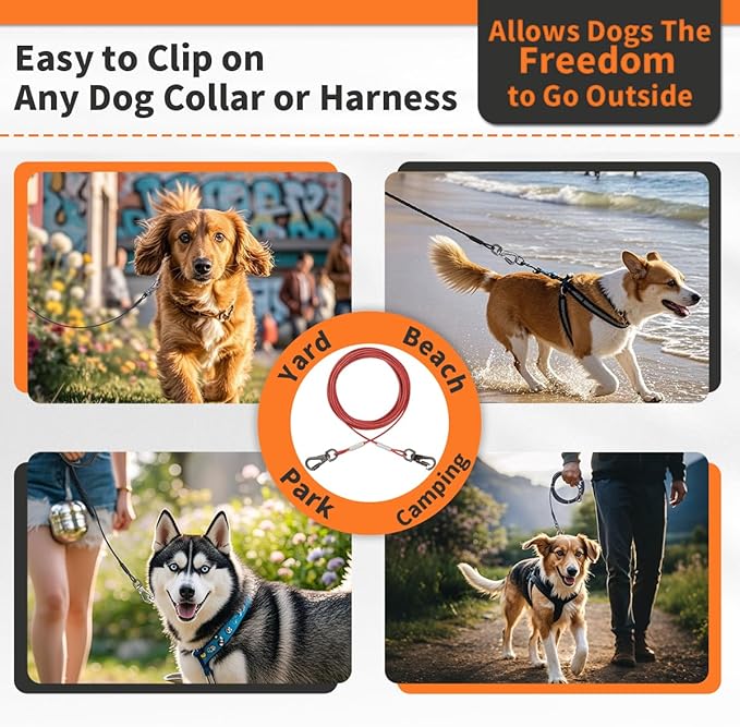 - Ease To Use&Total Freedom: This 10ft tie-out cable gives pets room to roam while keeping them secure.anchor to trees or stakes, or clip directly to your waist for hands-free walking and play. Packed effortlessly into its included tote bag, it’s perfect for yards, beaches, camping, or parks.
